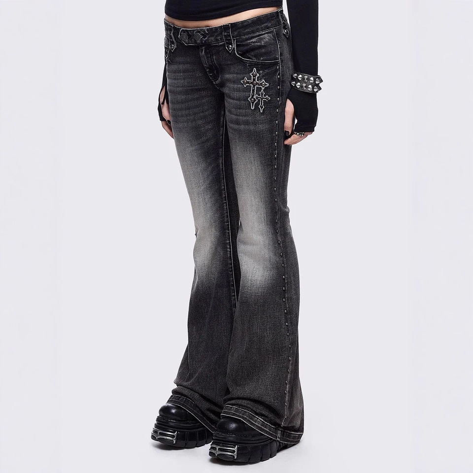Elitee women’s retro wing-pattern slim flared jeans. Low-rise full-length ice wash denim, perfect for casual, vintage, and street-style outfits.